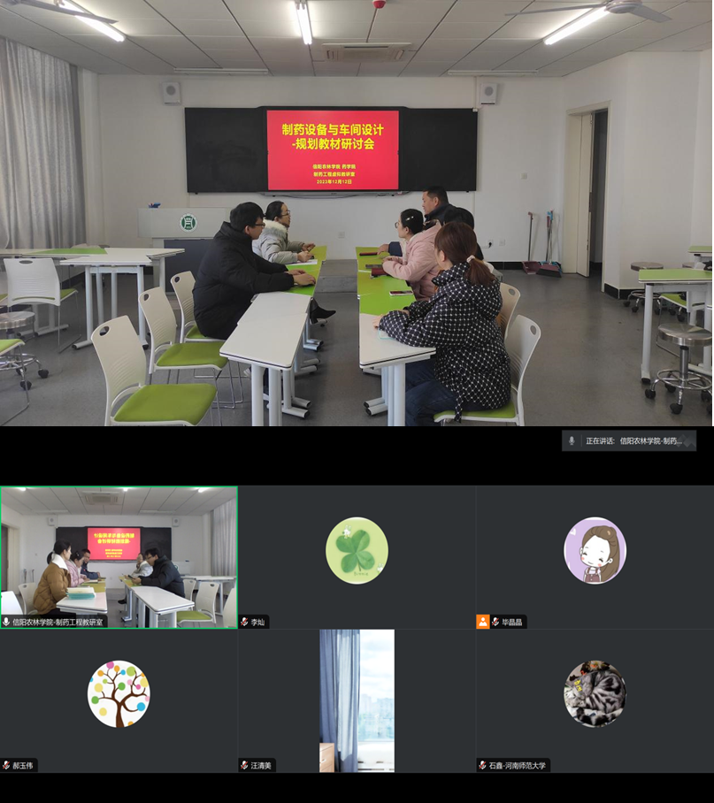 为有效提高药学院人才培养质量,推动规划教材建设工作,2023年12月12日中午,河南省制药工程虚拟教研室在E508组织召开《制药设备与车间设计》教材建设研讨会。研讨会由杨俊杰教授主持,毕晶晶、汪青美等教师参加此次会议,河南师范大学石鑫老师等虚拟教研室成员通过线上参加会议。